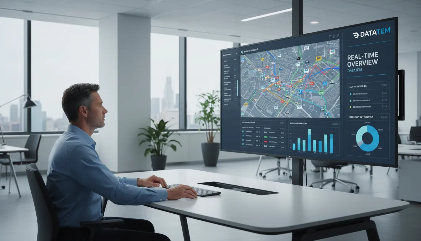 No rastreamento de frota, a precisão da localização em tempo real é fundamental. Sistemas de GPS e conectividade GPRS, 3G, 4G ou tecnologia 5G, como os fornecidos pela Datatem, permitem o acompanhamento contínuo dos veículos, otimização de rotas e alertas de desvio. A telemetria embarcada coleta dados sobre velocidade, consumo de combustível, comportamento do motorista e condições do veículo. Essa rica fonte de informações possibilita a identificação de padrões de condução arriscados, a programação de manutenções preventivas e a redução de custos operacionais.