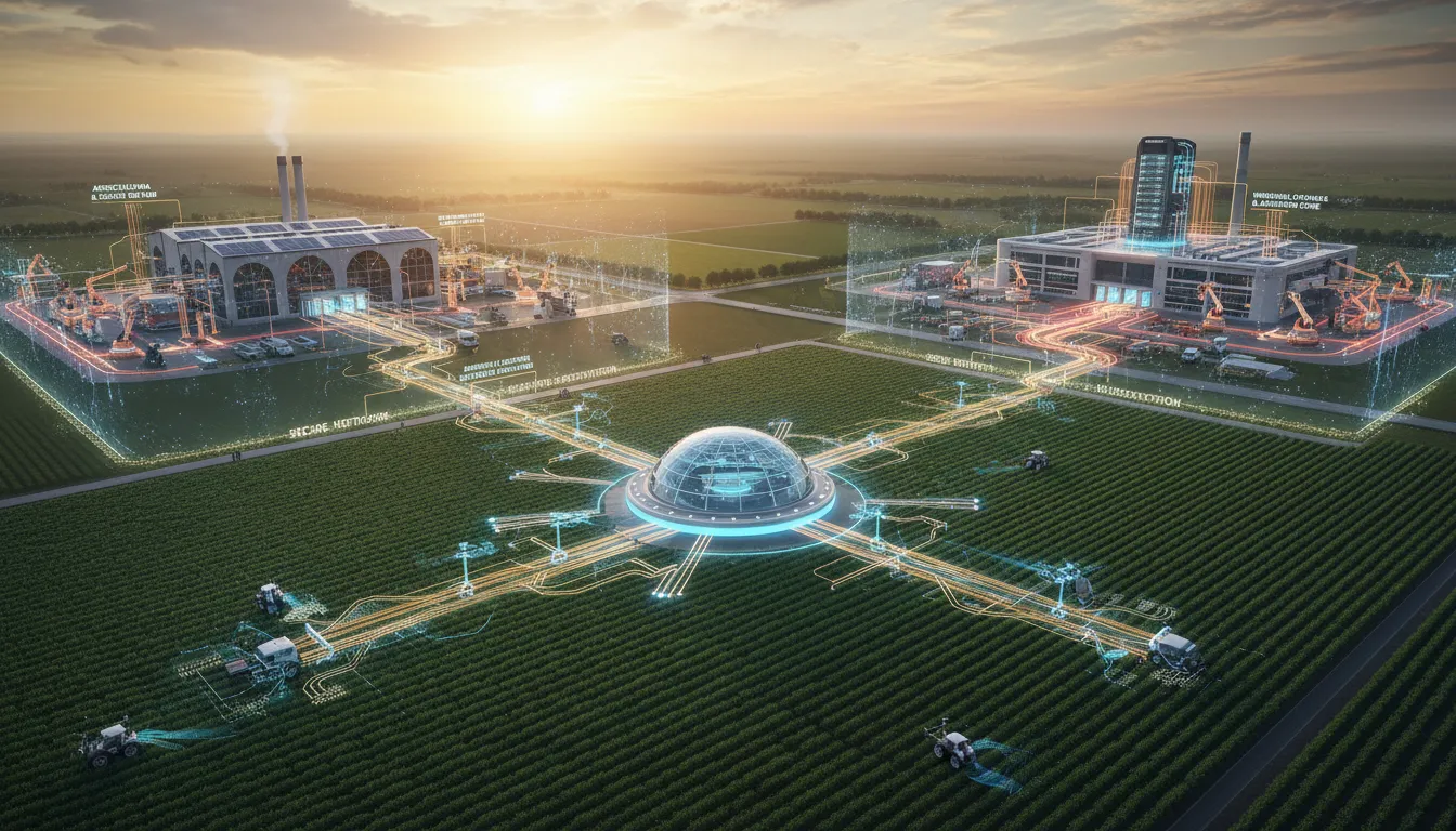 Máquinas agrícolas operando com símbolos de criptografia sobre sistemas conectados em campo verde sob céu azul.